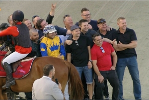 Sorridere began out wide at barrier seven and de Campo was happy to keep him near the rear before he sustained a sparkling last-lap burst, with final 400m sections of 28.1sec. and 28.4sec. He hit the front 100m from the post and won by a metre, rating 1.53.5.